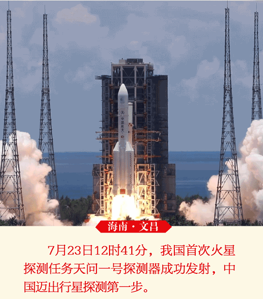 7月23日,天問一號在中國文昌航天發(fā)射場由長征五號遙四運載火箭發(fā)射升空,成功進入預定軌道,邁出了中國自主火星探測的第一步。